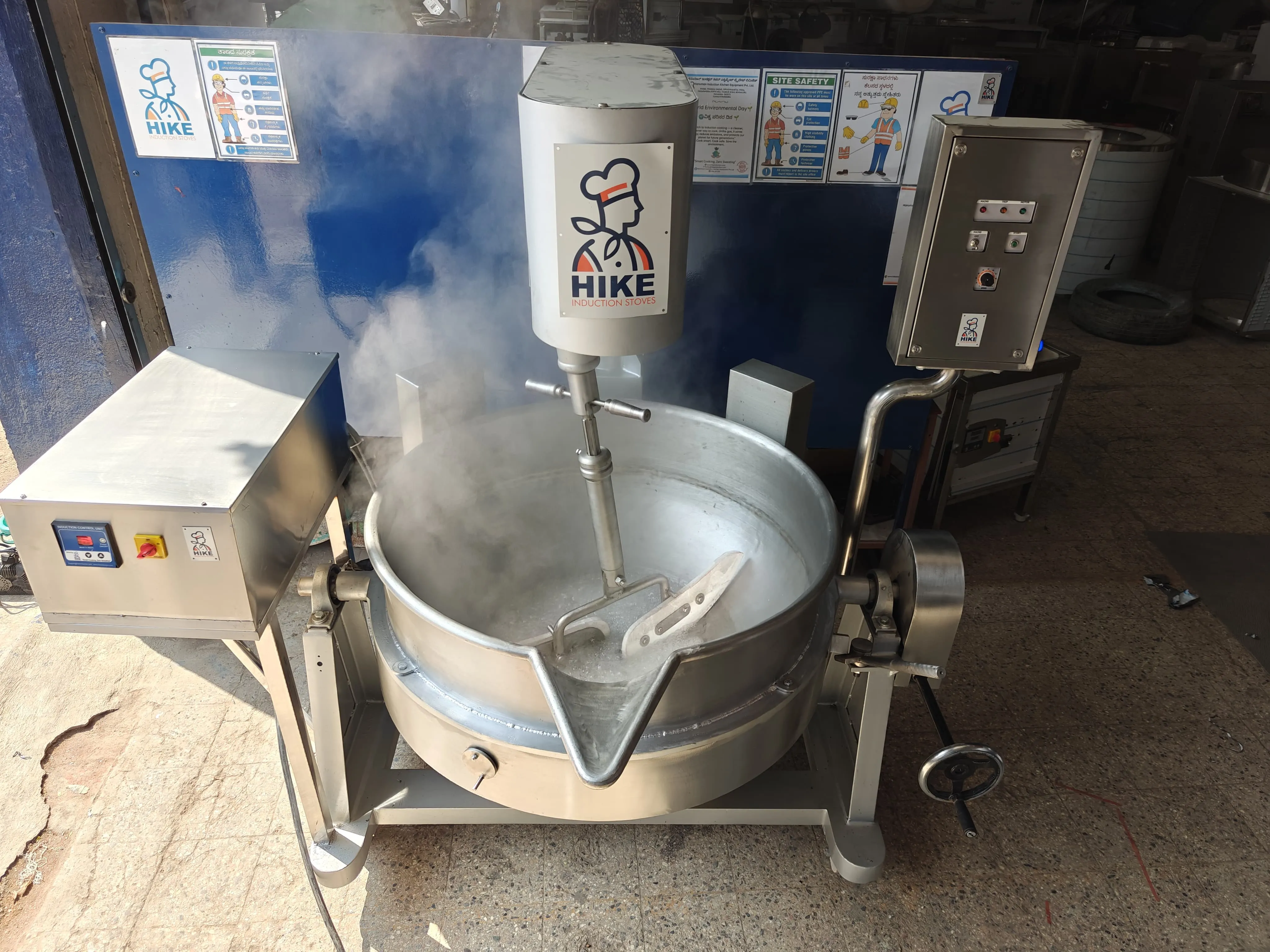 "Commercial Induction Cook Wok 200kG" Powerful, safe, and efficient, the HIKE 200KG" Commercial Induction Cook Wok is built for bulk Mixing with 200 kg capacity. Its stainless steel body, A/C cooling system,Manual Tilting Technology,Mixing with motor and also can adjust the mixing speed and induct