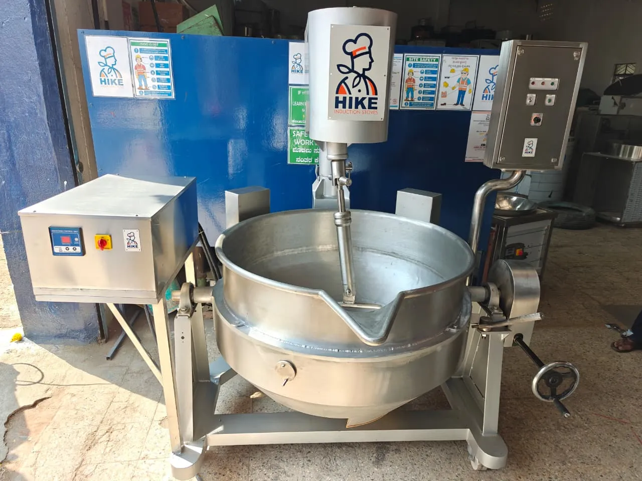 "Commercial Induction Cook Wok 200kG" Powerful, safe, and efficient, the HIKE 200KG" Commercial Induction Cook Wok is built for bulk Mixing with 200 kg capacity. Its stainless steel body, A/C cooling system,Manual Tilting Technology,Mixing with motor and also can adjust the mixing speed and induct